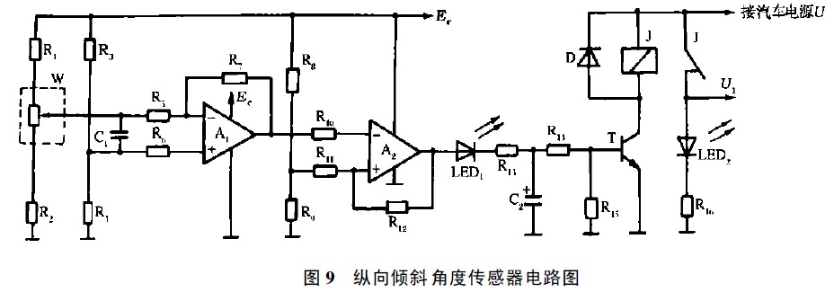 為了解決這一實(shí)際問(wèn)題,再用一只角度傳感器與車(chē)輛縱向布置,其電路如圖9所示。當(dāng)上坡坡度達(dá)到所規(guī)定的數(shù)值(如最大爬坡度)時(shí),運(yùn)放A2輸出端Uo4輸出高電平,繼電器J得電,常閉觸點(diǎn)斷開(kāi),切斷了增加制動(dòng)減速電路(圖7、圖8)的電源U1,使其不能工作,因?yàn)樵谶@種工況下,只要發(fā)動(dòng)機(jī)降低轉(zhuǎn)速,就會(huì)得到很好的減速效果,又避免了發(fā)動(dòng)機(jī)堵轉(zhuǎn)。而在其余工況下(爬坡度小于規(guī)定值時(shí)),繼電器J不吸合,減小發(fā)動(dòng)機(jī)油門(mén)開(kāi)度減速系統(tǒng)和增加制動(dòng)減速系統(tǒng)同時(shí)起作用,確保汽車(chē)獲得可靠的減速。在圖9電路圖中,發(fā)光二極管LED2作為增加制動(dòng)的減速系統(tǒng)工作電源指示。