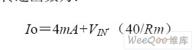 濕度傳感器輸出的0~3V 電壓通過XTR105 芯片的2 和13 引腳輸入。調整3 和4 引腳間的電阻RG和RG1 的值,可以改變XTR105 芯片的內置儀表放大器增益值,從而選定合適的測量范圍。RCM 取為1KO,它提供一個附加電壓降,使XTR105 的輸入電壓限制在共模方式下的電壓范圍內。與RCM 并聯(lián)的0.01μF 旁路電容用于降低共模噪聲。整個裝置的電壓,電流傳遞函數(shù)為:
