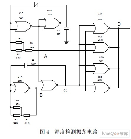 需要指出的是,圖3 所示的濕度傳感器零點電容比較大,靈敏度不夠高,濕度從0%~100%RH,電容的變化量不超過30~50PF。為此,最好將零點電容消除掉,在實際設計中我們用兩片CMOS4001 集成電路對圖3 進行改造,具體見圖4。