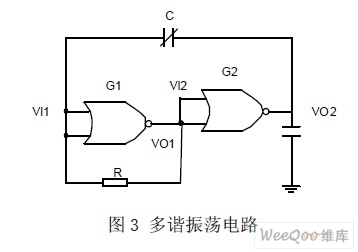 振蕩電路的作用是將電容的變化量轉化為頻率可變的方波。由圖3 可知,這是一個非對稱多諧振蕩器。或非門G1 工作在電壓傳輸特性的轉折區(qū),把它的輸出電壓直接連接到或非門G2 的輸入端。G2即可得到一個介于高低電平之間的靜態(tài)偏置電壓,從而使G2 的靜態(tài)工作點也處于電壓傳輸特性轉折區(qū)上。反饋環(huán)路中電容使電路在兩個暫穩(wěn)態(tài)之間往復振蕩。