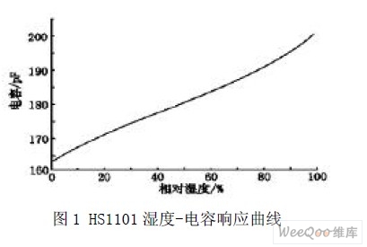 目前, 生產(chǎn)濕敏電容的主要廠家是法國Humirel 公司。它生產(chǎn)的HS1101 測量范圍是0%~100%RH,電容量由162PF 變到200PF,其誤差不大于±2%RH;響應時間小于5S;濕度系數(shù)為0.34PF/℃;年漂移量0.5%RH/年,長期穩(wěn)定。圖1 為HS1101 濕敏電容的濕度-電容響應曲線。