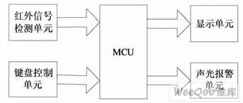 智能庫區(qū)防盜系統(tǒng)由MCU、紅外信號(hào)檢測、鍵盤控制、顯示單元、聲光報(bào)警等五個(gè)單元組成,系統(tǒng)框圖如圖1所示。