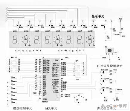 MCU是系統(tǒng)的控制單元,完成對(duì)紅外、鍵盤等輸入信號(hào)的處理,并向顯示、聲光等輸出單元發(fā)出相應(yīng)指令,MCU選用單片機(jī)AT89S52,AT89S52是一種低功耗、高性能8位微控制器,具有8k在系統(tǒng)可編程Flash存儲(chǔ)器,可滿足用戶代碼的存儲(chǔ)需要。