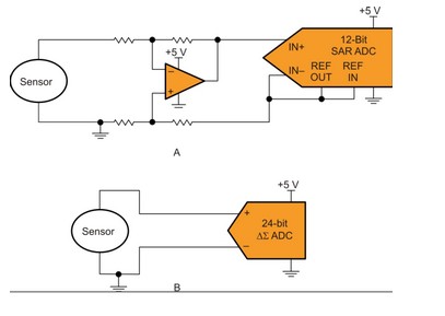 一個 24 位 Δ-Σ (B) 顯示了一個直接連接至轉換器的傳感器。