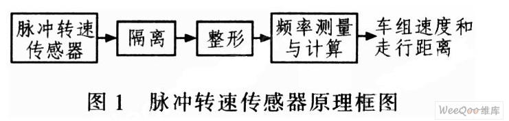 從上式可知,測量列車速度就是檢測列車車輪轉(zhuǎn)速和列車輪徑。脈沖轉(zhuǎn)速傳感器安裝在輪軸上,輪軸每轉(zhuǎn)動一周,傳感器輸出一定數(shù)目的脈沖,使脈沖頻率與輪軸轉(zhuǎn)速成正比。輸出的脈沖經(jīng)隔離和整形后直接輸入計算機CPU進(jìn)行頻率測量,再經(jīng)換算從而得出車組速度和走行距離閉。其原理框圖如圖1所示。
