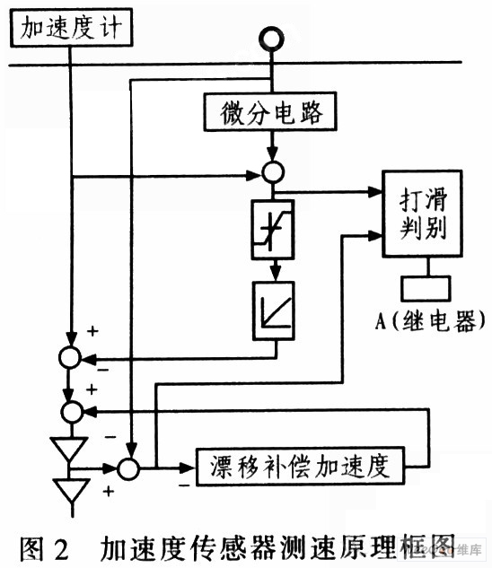 輪軸脈沖轉(zhuǎn)速傳感器也存在一定缺陷:即車輪空轉(zhuǎn)或打滑會使列車速度的測量結(jié)果存在誤差,為解決此類問題,在列車車軸上加裝一個加速度傳感器,配合脈沖轉(zhuǎn)速傳感器使用。該方式工作原理:在列車打滑期間,把機車的內(nèi)加速度作為測速的信息源,該信息與車輪旋轉(zhuǎn)的狀態(tài)等信息不相關(guān),而在其余工作時間仍用輪軸脈沖傳感器測速,所以該方式稱為基于慣性加速度傳感器的測速。在車輪打滑時,由加速度傳感器測得加速度及車輪打滑前加速度的傾斜分量,而計算出車輪打滑時的列車運行加速度,再將該值積分即得車輪打滑時列車實時運行的速度。具體原理如圖2所示。
