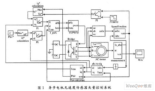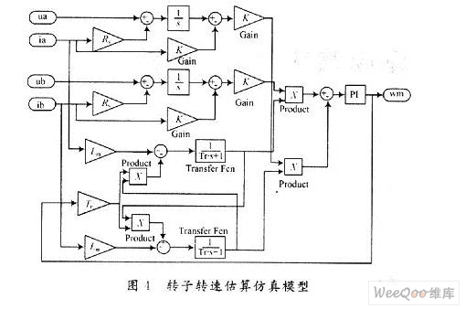 對于高性能的磁場定向控制系統(tǒng),速度閉環(huán)是必不可少的,轉(zhuǎn)速閉環(huán)需要實時的電機(jī)轉(zhuǎn)速,目前速度反饋量的檢測多是采用光電脈沖編碼器、旋轉(zhuǎn)變壓器或測速發(fā)電機(jī)。但是,許多場合下不允許安裝任何速度傳感器,此外安裝速度傳感器在一定程度上降低了系統(tǒng)的可靠性。因此,無速度傳感器控制的高性能通用變頻器是當(dāng)前全世界自動化技術(shù)和節(jié)能應(yīng)用中受到普遍關(guān)心的產(chǎn)品和開發(fā)課題。無速度傳感器磁場定向矢量控制技術(shù)的核心是如何準(zhǔn)確的獲取磁場定向角以及電機(jī)的轉(zhuǎn)速信息。2000年,日本電氣學(xué)會調(diào)查了日本各大電氣公司生產(chǎn)的無速度傳感器控制的通用變頻器,把無速度傳感器控制方式分為4類:定子電流轉(zhuǎn)矩分量誤差補(bǔ)償法;感應(yīng)電動勢計算法;模型參考自適應(yīng)(MRAS)法;轉(zhuǎn)子磁鏈角速度計算法。其中感應(yīng)電動勢計算法和轉(zhuǎn)子磁鏈角速度計算法是基于電機(jī)數(shù)學(xué)模型來計算轉(zhuǎn)速,屬于開環(huán)計算轉(zhuǎn)速,轉(zhuǎn)速計算的精確度容易受到干擾,而定子電流轉(zhuǎn)矩分量誤差補(bǔ)償法與MRAS法是基于閉環(huán)控制作用構(gòu)造轉(zhuǎn)速,可以抑制這種干擾。定子電流轉(zhuǎn)矩分量誤差補(bǔ)償法結(jié)構(gòu)簡單,已在一些變頻器產(chǎn)品中得到應(yīng)用,但所產(chǎn)生的動態(tài)轉(zhuǎn)速準(zhǔn)確性欠佳。MRAS法則基于轉(zhuǎn)子磁鏈觀測電壓模型與電流模型構(gòu)造轉(zhuǎn)速辨識模型,算法簡單,能實時跟蹤電機(jī)轉(zhuǎn)速變化。在此結(jié)合應(yīng)用SVPWM技術(shù)構(gòu)建了轉(zhuǎn)子磁場定向無速度傳感器矢量控制系統(tǒng),采用MRAS法得到轉(zhuǎn)子轉(zhuǎn)速辨識模型,對速度進(jìn)行估算。利用Matlab/Simulink對系統(tǒng)進(jìn)行仿真,以驗證所設(shè)計的控制系統(tǒng)的性能。