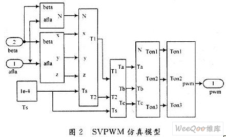 異步電機(jī)無速度傳感器矢量控制系統(tǒng)如圖1所示,主要包括三相異步電機(jī)模塊,SVPWM模塊,PI模塊,坐標(biāo)變換模塊,轉(zhuǎn)子磁鏈估算模塊,轉(zhuǎn)子轉(zhuǎn)速估算模塊,逆變器模塊等。該系統(tǒng)主電路采用SVPWM調(diào)制逆變器,控制電路中,給定轉(zhuǎn)速與估算轉(zhuǎn)速經(jīng)過速度調(diào)節(jié)器得到轉(zhuǎn)矩,與估算磁鏈值計算得到電流isq,經(jīng)過電流調(diào)節(jié)器,再經(jīng)過PARK逆變換得到兩相靜止電壓,經(jīng)過SVPWM調(diào)制,控制逆變器電壓輸出,進(jìn)而控制三相異步電機(jī)。SVPwM控制的基本思想是將電機(jī)與逆變器看成一個整體,最終在電機(jī)內(nèi)部形成圓形磁場,以達(dá)到更好的控制效果,SVPWM控制的仿真模型如圖2所示。