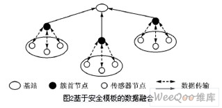 如圖2所示,基于安全模板的數(shù)據(jù)融合機(jī)制,是通過少量數(shù)據(jù)傳輸替代大量數(shù)據(jù)傳輸?shù)姆椒▉砀M(jìn)一步地降低簇內(nèi)的網(wǎng)絡(luò)通信量[5]。其中,傳感器節(jié)點(diǎn)并不直接傳輸采集數(shù)據(jù),而是用從簇首節(jié)點(diǎn)接收到的安全模板生成采集數(shù)據(jù)的組合代碼后再上傳;簇首節(jié)點(diǎn)接收到傳感器節(jié)點(diǎn)上傳的代碼數(shù)據(jù),檢查冗余后有選擇地向部分傳感器節(jié)點(diǎn)申請(qǐng)傳輸實(shí)際數(shù)據(jù),以有效降低簇內(nèi)的網(wǎng)絡(luò)通信量。最后,簇首節(jié)點(diǎn)從選定的傳感器節(jié)點(diǎn)接收到無冗余的采集數(shù)據(jù)并直接上傳基站。