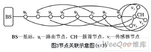 為盡早檢出和丟棄由被攻擊節(jié)點(diǎn)注入的虛假數(shù)據(jù)包,以達(dá)到安全需要和降低由此產(chǎn)生的能源消耗,文獻(xiàn)[7]將交互驗(yàn)證的思想進(jìn)一步擴(kuò)展,在簇首節(jié)點(diǎn)到基站的數(shù)據(jù)傳送鏈路上的各個(gè)節(jié)點(diǎn)間建立關(guān)聯(lián)關(guān)系,如圖3所示,從而所有節(jié)點(diǎn)以一種交錯(cuò)的逐跳方式驗(yàn)證其要傳遞的數(shù)據(jù)包。只有t+1(t是設(shè)定的安全上限,取簇內(nèi)的節(jié)點(diǎn)數(shù))個(gè)節(jié)點(diǎn)全部通過認(rèn)證,數(shù)據(jù)包才能被傳遞到基站,因此,只要被攻擊的節(jié)點(diǎn)數(shù)小于等于t,基站或沒有被攻擊的節(jié)點(diǎn)就能檢測(cè)出并丟棄由入侵者注入的虛假數(shù)據(jù)包。