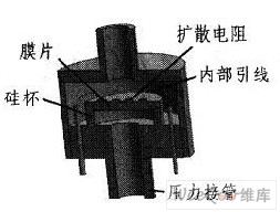 所設(shè)計(jì)的壓阻式壓力微傳感器,其制法是將N型硅腐蝕成厚10~25μm的膜片,并在一面擴(kuò)散了4個(gè)阻值相等的P型電阻。硅膜片周邊用硅杯固定,則當(dāng)膜片兩面有壓力差時(shí),膜片即發(fā)生變形,從而導(dǎo)致電阻變化。用微電路檢測(cè)出這種電阻變化,通過(guò)計(jì)算即可得出壓力變化如圖2所示。