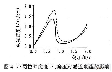 利用公式可計(jì)算出不同拉伸應(yīng)變下隧穿電流隨偏壓的變化,如圖4所示。圖中實(shí)線、虛線分別表示0和5%的拉伸應(yīng)變。計(jì)算偏壓分別為0.75 V和1.2 V時(shí)的壓阻系數(shù)為: