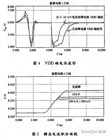 本文采用兩階多米諾并行加法器級聯(lián)電路進行測試,通過注入有阻開路故障對電路進行測試,并和無故障電路進行比較。圖4是無故障電路和注入10 kΩ電阻故障電路的VDD端電壓波形比較;圖5是無故障電路和注入不同阻值的有阻開路故障電路中瞬態(tài)電流積分曲線的比較。