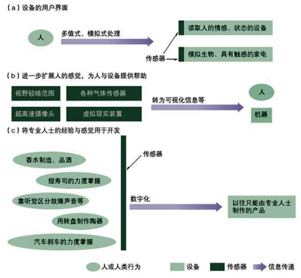 第三個應用就是通過傳感器讓設備具有專業(yè)人士的技能。五感傳感器可以將捏壽司的力度大小、香水調香師的嗅覺、美食家的味覺等感覺信息數(shù)值化,并用于開發(fā)產品。在汽車行業(yè),已經開始采用支持超高幀速率的攝像頭來進行沖突測試分析,還開發(fā)了嵌入壓力傳感器的輪胎,通過傳感器將螺釘最合適的松緊度進行數(shù)值化的技術也正在開發(fā)中。