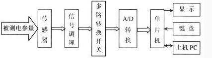 檢測系統(tǒng)構(gòu)成如圖2,被測量經(jīng)霍爾傳感器轉(zhuǎn)換為電壓信號,經(jīng)信號調(diào)理電路和多路轉(zhuǎn)換開關(guān)選擇,通過A/D轉(zhuǎn)換器送給單片機(jī),單片機(jī)采用89C51,是該系統(tǒng)的主控器,鍵盤選用2×4鍵盤,用于選擇被測量的種類,采用數(shù)碼管或液晶顯示被測量的大小。