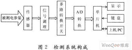 檢測系統(tǒng)構(gòu)成如圖2,被測量經(jīng)霍爾傳感器轉(zhuǎn)換為電壓信號,經(jīng)信號調(diào)理電路和多路轉(zhuǎn)換開關(guān)選擇,通過A/D轉(zhuǎn)換器送給單片機,單片機采用89C51,是該系統(tǒng)的主控器,鍵盤選用2×4鍵盤,用于選擇被測量的種類,采用數(shù)碼管或液晶顯示被測量的大小。