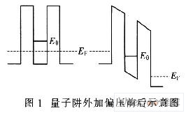 介觀壓阻效應(yīng)的定義為“等效電阻的應(yīng)力調(diào)制”,等效電阻是對共振隧效應(yīng)的一種具體描述。由4個物理過程組成:①在力學(xué)信號下,納米結(jié)構(gòu)中的應(yīng)力分布將發(fā)生變化;②一定條件下應(yīng)力變化可引起內(nèi)建電場的產(chǎn)生;③內(nèi)建電場將導(dǎo)致納米帶結(jié)構(gòu)中量子能級發(fā)生變化;④量子能級變化會引起共振隧穿電流變化。簡言之,在共振隧穿附近,通過上述過程,可將一個微弱的力學(xué)信號轉(zhuǎn)化。為一個較強的電學(xué)信號,體現(xiàn)出較大的壓阻系數(shù)。這里所用的介觀壓阻效應(yīng)元件為GaAs/A1As/InGaAs DBRT結(jié)構(gòu)薄膜納米級窄帶隙材料。隨著外部壓力引起的拉伸應(yīng)變的變化(如圖1所示),DBRT結(jié)構(gòu)的共振隧穿電流和阻抗顯著變化。并且,阻抗應(yīng)變輸出可由外部電壓有效調(diào)節(jié)。其優(yōu)點是靈敏度高、靈敏度可調(diào)、靈敏度隨溫度變化小。