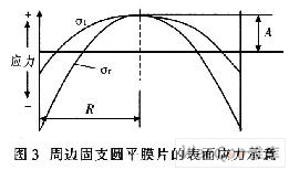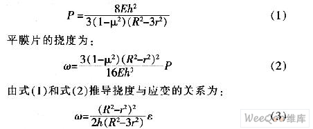 計算時假設(shè):小撓度理論;壓力是均勻作用于平膜片表面。由平膜片的應(yīng)力計算公式可知: