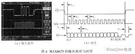 監(jiān)測溫度信號為K型熱電偶的輸出信號。而熱電偶信號調(diào)理電路包含有冷端補償,線性化,放大電路。經(jīng)過調(diào)理后的熱電偶信號再送往A/D轉(zhuǎn)換器進行模數(shù)轉(zhuǎn)換。據(jù)資料顯示,這3部分電路的設(shè)計及調(diào)試,難度過高且所占體積也不小,所以都不是設(shè)計首選。因此對熱電偶信號的調(diào)理及采集采用專用器件MAX6675。MAX6675是Maxim公司生產(chǎn)的帶有冷端補償、線性校正、熱電偶斷線檢測的串行K型熱電偶模數(shù)轉(zhuǎn)換器,其溫度分辨能力為0.25℃,冷端補償范圍為-20℃~十80℃,工作電壓為3.0~5.5 V。該器件不僅大大簡化電路設(shè)計,縮小溫度信號處理模塊的體積,而且可直接將模擬信號轉(zhuǎn)換成12bit的數(shù)字量,而且接口簡單,采用SPI串行接口,方便與單片機通信。該器件采用SO-8封裝,體積小,可靠性高。圖4為單片機控制MAX6675的輸出波形及時序。