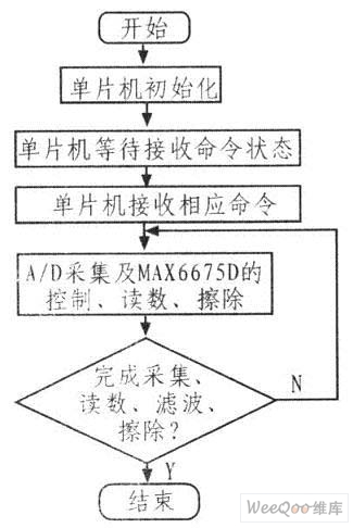 使用C8051單片機作為控制器?刂茰y量信號的采集及與MAX6675的接口,且通過RS-232串口與上位機實現(xiàn)數(shù)據(jù)交換,上位機通過串口向采集系統(tǒng)發(fā)送命令,控制其工作的狀態(tài)。同時采集系統(tǒng)還帶有1 GB的Flash,實現(xiàn)數(shù)據(jù)的存儲功能。該系統(tǒng)的程序流程如圖5所示。