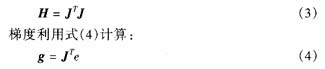 其中Levenberg-Marquardt法簡稱L-M算法,是一種將最陡下降法和牛頓法相結合的算法。它的本質是二階梯度法,故具有很快的收斂速度;诖,文中采用L-M算法來訓練BP網絡。它不需要計算Hessian矩陣,而是利用式(3)進行估算: