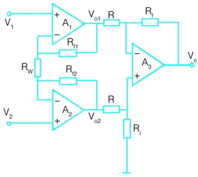 運(yùn)放a1和a2組成的同相輸入差動(dòng)電路失調(diào)電流、電壓、噪聲和漂移都很小,具有高輸入阻抗、高共模抑制比和開環(huán)增益,對(duì)微小的差模電壓很敏感,并適用于測(cè)量遠(yuǎn)距離傳輸過(guò)來(lái)的信號(hào),適宜于微小信號(hào)輸出的壓力傳感器放大。電路可通過(guò)調(diào)節(jié)電阻rw來(lái)調(diào)整放大倍數(shù)。