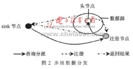 (5)多級(jí)數(shù)據(jù)分發(fā)方案(multi-resolution data dissemination scheme)[4],綜合了LS和DCS數(shù)據(jù)分發(fā)方案的技術(shù)。其基本思想是在數(shù)據(jù)源中選擇一個(gè)頭節(jié)點(diǎn),代表源節(jié)點(diǎn)在最近的注冊節(jié)點(diǎn)上進(jìn)行注冊。sink節(jié)點(diǎn)把查詢發(fā)送到所有注冊節(jié)點(diǎn)上,從注冊節(jié)點(diǎn)再把查詢發(fā)送到所有匹配的頭節(jié)點(diǎn),當(dāng)頭節(jié)點(diǎn)收到查詢后,在數(shù)據(jù)源內(nèi)選擇一組節(jié)點(diǎn)進(jìn)行查詢。由于sink節(jié)點(diǎn)的位置包含在它分派的查詢中,查詢節(jié)點(diǎn)可以直接把感知數(shù)據(jù)發(fā)送給sink節(jié)點(diǎn),其基本思想如圖2所示。這種數(shù)據(jù)分發(fā)方案避免了查詢泛洪,能有效減少能量消耗。但是在數(shù)據(jù)源中只是基于感知范圍參數(shù)來選擇查詢節(jié)點(diǎn),沒有考慮數(shù)據(jù)的分布情況。