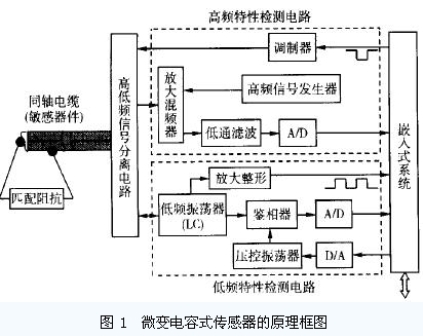 設(shè)計(jì)的微變電容式傳感器的原理框圖如圖1 所示。該傳感器由同軸電纜、高低頻信號分離電路、高頻特性檢測電路、低頻特性檢測電路和嵌入式系統(tǒng)等組成。高頻特性檢測電路監(jiān)測同軸電纜特性阻抗的變化, 而低頻特性監(jiān)測電路則監(jiān)測同軸電纜分布電容的變化, 兩電路相互補(bǔ)充完成對同軸電纜的局部變形的監(jiān)測和定位。