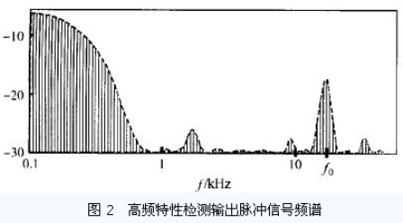 為了消除高頻信號在同軸電纜的遠(yuǎn)端產(chǎn)生的反射, 一般在同軸電纜的遠(yuǎn)端接一匹配阻抗.由高頻信號發(fā)生器產(chǎn)生的900MHz 的高頻信號經(jīng)100 Hz 的脈沖信號調(diào)制后輸出到同軸電纜, 高頻信號傳輸?shù)酵S電纜的遠(yuǎn)端后, 被匹配阻抗吸收轉(zhuǎn)換為熱能.當(dāng)同軸電纜的某處受外力而變形時, 局部特性阻抗發(fā)生變化, 形成駐波比大于0 的駐波點(diǎn), 高頻信號產(chǎn)生強(qiáng)反射. 反射回高低頻信號分離電路的高頻信號又會產(chǎn)生反射Z高頻信號在同軸電纜中傳輸時, 能量逐漸衰減. 由高低頻信號分離電路耦合到放大混頻電路的高頻信號的持續(xù)時間和幅度除與同軸電纜受外力的大小有關(guān)外, 還與外力所處的位置有密切的關(guān)系Z混頻后的高頻信號經(jīng)低頻濾波電路的作用后, 輸出攜帶外力位置的脈沖信號. 該脈沖信號與原調(diào)制脈沖相比產(chǎn)生了較大的畸變. 為了提取同軸電纜受力后局部變形的空間位置, 利用嵌入式系統(tǒng)對攜帶外力信息的低頻脈沖信號進(jìn)行處理, 得到如圖2 所示的信號頻譜.