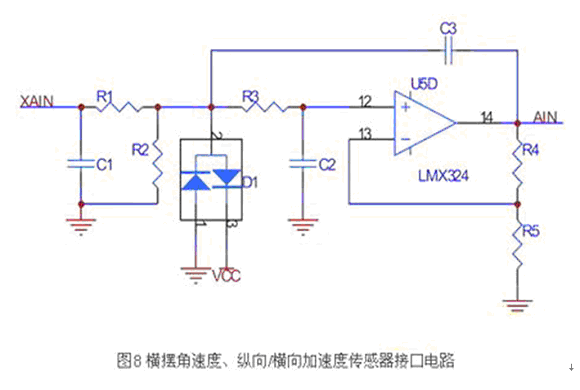 橫擺角速度、縱向/橫向加速度傳感器的安裝位置基本相同,輸出都是0V-5V的模擬量,由于汽車顛簸造成的信號波動特性一致,故封裝在同一模塊中。其硬件接口如圖8所示,實現(xiàn)硬件模擬前置濾波,以抑制來自傳感器的模擬信號中的高頻噪聲成分,防止在采樣過程中出現(xiàn)混疊現(xiàn)象。運(yùn)放使用滿擺幅輸出的LMX324。