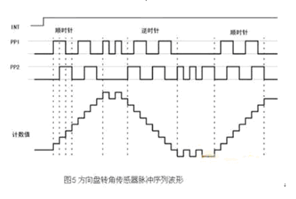 方向盤轉(zhuǎn)角傳感器的輸出為正交編碼脈沖。正交編碼脈沖包含兩個脈沖序列,有變化的頻率和四分之一周期(90°)的固定相位偏移,如圖5所示。通過檢測2路信號的相位關(guān)系可以判斷為順時針方向和逆時針方向,并據(jù)此對信號進(jìn)行加/減計數(shù),從而得到當(dāng)前的計數(shù)累計值,也即方向盤的絕對轉(zhuǎn)角,而轉(zhuǎn)角的變化率即角速度,則可通過信號頻率測出。另外,方向盤轉(zhuǎn)角傳感器有一個零位輸出信號,當(dāng)方向盤在中間位置時,該信號輸出0V,否則輸出5V,通過該信號,可對絕對轉(zhuǎn)角進(jìn)行在線校準(zhǔn)。