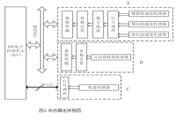 本文所作設(shè)計的框圖如圖4所示。在圖中,方向盤轉(zhuǎn)角傳感器信號經(jīng)微控制器處理后,通過CAN總線發(fā)送給ECU(圖4中B);橫擺角速度傳感器、縱向/橫向傳感器由于信號特點(diǎn)和安裝位置類似,故設(shè)計在同一個模塊內(nèi)(圖4中A);由于ESP對輪速傳感器信號的實時性要求較高,故經(jīng)過信號調(diào)理后,直接送入ECU(圖4中C)。在圖4的A和B中,需要微處理器對信