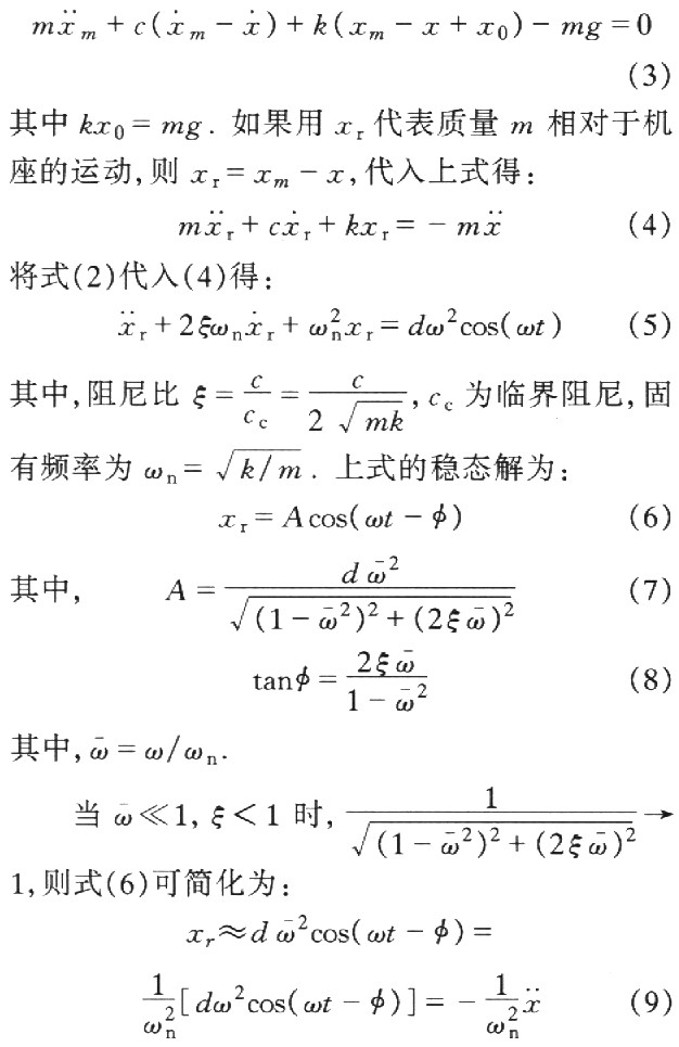 以上光纖光柵傳感器的結(jié)構(gòu)可以簡(jiǎn)化為由集中質(zhì)量m、集中剛度k和集中阻尼c組成的二階單自由度受迫振動(dòng)系統(tǒng),其振動(dòng)力學(xué)模型如圖2所示.其中機(jī)座振動(dòng)的位移是x,質(zhì)量塊m振動(dòng)的絕對(duì)位移是xm,彈簧力為k(x-xm),阻尼力為.設(shè)在外力F的作用下機(jī)座作簡(jiǎn)諧振動(dòng)的位移是:
