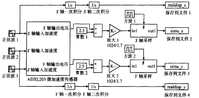 其中,方框內(nèi)的子系統(tǒng)模型即是封裝好的ADXL203微加速度傳感器模型。模型最后將采樣的加速度值存入文件中,然后,通過編程來模擬微控制器中運(yùn)行的不同積分算法,用Matlab來圖示各個(gè)算法的模擬結(jié)果,對(duì)于系統(tǒng)算法的比較和選擇有很大幫助。