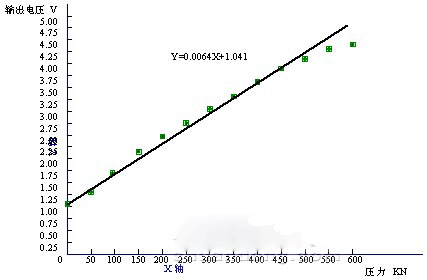 圖4為壓力值和輸出電壓值的關(guān)系曲線,雖存在電橋電路的非線性,電阻應(yīng)變片的非線性和彈性元件的非線性等因素,但由傳感器工作特性曲線我們可以看出,在重要工作區(qū)間(1~500KN),壓力值和輸出電壓值存在較好的線性關(guān)系。
