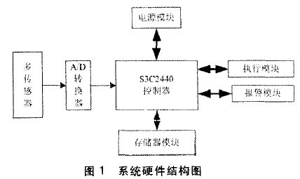 本方案硬件系統(tǒng)的核心控制器是采用三星的具有ARM920T核的16/32位多功能、低功耗的嵌入式處理器S3C2440。S3C2440是韓國(guó)三星公司推出的一款高檔的,可用于工業(yè)控制、智能家電等便攜產(chǎn)品開(kāi)發(fā)的嵌入式微處理器,其主頻處理速度達(dá)到400MHz,完全可以滿足火災(zāi)監(jiān)控報(bào)警的實(shí)時(shí)性處理要求。其主控制芯片及豐富的外圍接口電路可用于連接各類數(shù)字設(shè)備從而實(shí)現(xiàn)數(shù)據(jù)交換。基于多傳感器數(shù)據(jù)融合的火災(zāi)預(yù)警系統(tǒng)采用模塊化結(jié)構(gòu),主要由傳感器模塊、 A/D轉(zhuǎn)換模塊、S3C2440控制器、報(bào)警模塊、執(zhí)行模塊和控制器必需的電源模塊和存儲(chǔ)器模塊組成,圖1為系統(tǒng)結(jié)構(gòu)圖。