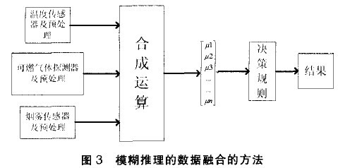 本設(shè)計(jì)對(duì)火災(zāi)監(jiān)測(cè)使用了溫度傳感器,可燃?xì)怏w探測(cè)器的煙霧探測(cè)器,數(shù)據(jù)融合的方法如圖3。