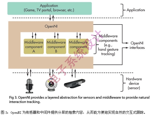 主機(jī)完成更高層的對(duì)象和動(dòng)作識(shí)別。OpenNI(自然交互)組織提供了框架和應(yīng)用編程接口(API),用于處理像Kinect這樣的設(shè)備。OpenNI支持包括視頻和音頻設(shè)備在內(nèi)的許多設(shè)備(圖3),還能通過(guò)更高端的中間件執(zhí)行對(duì)象跟蹤等功能。