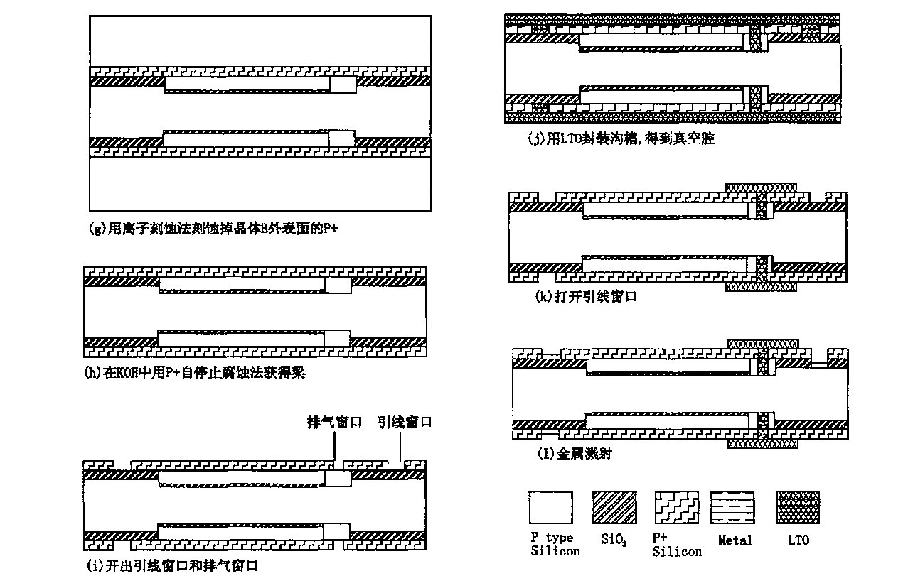排氣窗口刻蝕出以后,用LTO封裝這個(gè)排氣窗口,用LTO封裝以后,腔里的空氣壓力幾乎為零。那么這個(gè)傳感器就可以測絕對壓力。