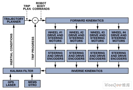 每個車輪的驅動軸和轉向軸編碼器測量結果在正向運動學 處理器中用阿克曼轉向公式進行組合,從而產(chǎn)生駛向、偏轉速率、位置和線速度等測量數(shù)據(jù)。