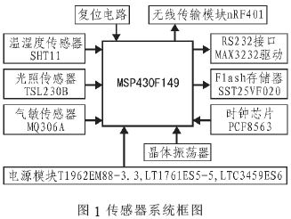 整個(gè)傳感器系統(tǒng)包括微處理器模塊( 16 位單片機(jī)MSP430F149、日歷時(shí)鐘芯片、復(fù)位電路及外圍電路) 、傳感器測(cè)量模塊( 溫濕度傳感器、光照強(qiáng)度傳感器、半導(dǎo)體型可燃?xì)怏w敏感元件MQ306A) 、存儲(chǔ)器模塊( Flash 存儲(chǔ)器SST25VF020) 、數(shù)據(jù)通信模塊( 串口通信、無(wú)線通信) 、電源模塊( LT1962EMS83.3、LT1761ES5- 5、LTC3459ES6) , 系統(tǒng)框圖如圖1。