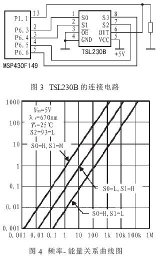 該系統(tǒng)選用了TI 公司的TSL230B 來(lái)測(cè)量環(huán)境周圍的光線強(qiáng)度。該器件采用先進(jìn)的LinCMOSTM 工藝, 主要由多晶硅光電二極管和單片CMOS 電流頻率集成轉(zhuǎn)換器構(gòu)成。不需外接元件即可完成高分辨率的光照度/頻率轉(zhuǎn)換?蓪⒁欢ü庾V的光轉(zhuǎn)換成電流, 再由電流/頻率轉(zhuǎn)換器轉(zhuǎn)換成相應(yīng)的脈沖頻率。輸出方波或者三角波的頻率完全由光照幅度決定, 分辨率高, 可以直接與微處理器相連, 如圖3所示。S0、S1 為靈敏度控制端, 實(shí)際上是通過(guò)改變器件上方的感光面積來(lái)調(diào)整靈敏度; S2、S3 為滿量程選擇端; OUT 為頻率信號(hào)輸出端, 進(jìn)入單片機(jī)的捕獲輸入, 通過(guò)計(jì)算兩次捕獲時(shí)間內(nèi)計(jì)數(shù)器的數(shù)值差, 便可以計(jì)算出輸出頻率值, 根據(jù)圖4 所示的頻率- 能量關(guān)系曲線圖對(duì)照, 從而得到光線強(qiáng)度( 單位: μW/cm2) 。
