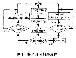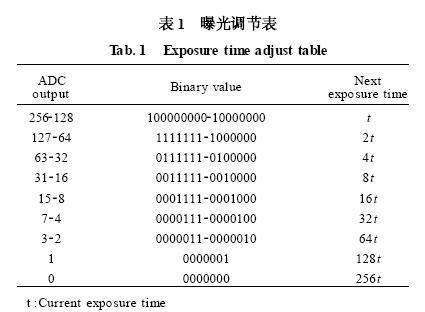 CMOS圖像傳感器以T或用戶設定時間開始曝光。當?shù)?幀有效圖像采集結束開始輸出時,曝光控制系統(tǒng)將統(tǒng)計幀內(nèi)指定區(qū)域的像素飽和數(shù),并記錄幀內(nèi)最大非飽和像素電壓,即當前曝光條件下圖像傳感器的最大分辨率。當幀內(nèi)像素飽和數(shù)超過統(tǒng)計閾值,表明曝光過長,將縮短下一幀曝光時間;相反,判斷最大非飽和像素電壓是超出ADC輸出量程1/2。當未超過時,表明曝光不夠,由曝光調(diào)節(jié)表(表1)改變下幀曝光時間;否則按原有曝光時間繼續(xù)曝光,曝光判決流程如圖1所示。ADC輸出與光照關系為