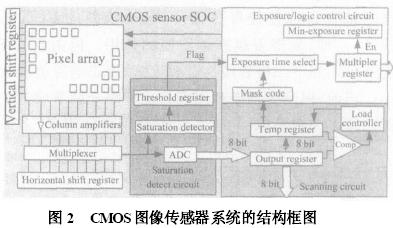 鑒于片上反饋系統(tǒng)對自適應調(diào)節(jié)快速實時等特點,針對實際視覺和工控測量應用等要求,本文從CMOS圖傳感器像素陣列的數(shù)字控制和預處理電路出發(fā),以現(xiàn)有滾筒式曝光為背景,提出了一套通過自適應調(diào)節(jié)曝光和用戶預設方式曝光的CMOS圖像傳感器系統(tǒng),曝光時間可從1μs至65ms,在光電響應效率為1.0V/lux·s、可調(diào)增益為1和8bit模數(shù)轉換器(ADC)情況下,探測光強范圍可達到10-1~106lux,大幅提高現(xiàn)有CMOS圖像傳感器線性自適應響應能力。