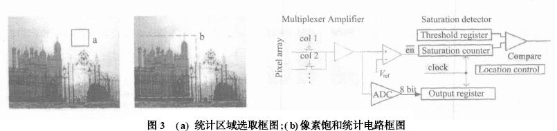 像素值超過255稱為飽和(數(shù)據(jù)采集為8bitADC),該部分主要完成對像素陣列內(nèi)指定區(qū)域飽和像素值的統(tǒng)計。由于在特定場合(如夜間監(jiān)視系統(tǒng)),零星燈光或反射光將造成圖像部分像素出現(xiàn)飽和,如圖3(a)區(qū)域a示。如果按照此飽和值調(diào)節(jié)曝光,將降低圖像整體分辨率。因此,設計采用允許用戶在圖像任意位置設定任意大小的飽和統(tǒng)計區(qū)域及閾值的方法來避免上述干擾,如圖3(a)中b為用戶統(tǒng)計區(qū)域,即關注區(qū)域。