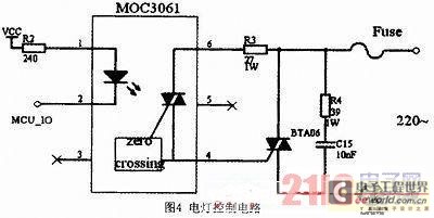 本系統(tǒng)由光電傳感器檢測(cè)洗手間內(nèi)是否有人,單片機(jī)進(jìn)行計(jì)數(shù),當(dāng)N不為零時(shí),單片機(jī)會(huì)向與MOC3061芯片引腳相連的端口輸送信號(hào),然后通過(guò)可控硅來(lái)控制燈的開、關(guān)。其中R3是雙向可控硅的門極電阻,當(dāng)可控硅靈敏度較高時(shí),門極阻抗也很高,并上R3可提高抗干擾能力。 39Ω電阻和0.01μF電容組成浪涌吸收電路,防止浪涌電壓損壞雙向可控硅。其電路圖如圖4所示。