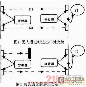 本系統(tǒng)中設(shè)計(jì)了兩個(gè)對(duì)射型光電傳感器,當(dāng)有人通過(guò)時(shí),若是光路(1)先檢測(cè)到信號(hào),則表明此人是進(jìn)洗手間,計(jì)數(shù)器加1,若是光路(2)先檢測(cè)到信號(hào),則表明此人是出洗手間,計(jì)數(shù)器減1,即兩個(gè)對(duì)射型光電傳感器是用來(lái)檢測(cè)和判斷是否有人進(jìn)出洗手間。