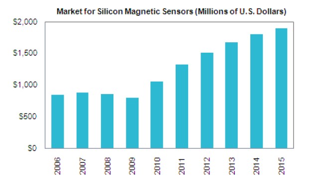 磁傳感器進入了加速發(fā)展的時代。度過了2009的低潮,到了2010基于硅的磁傳感器有了快速的增長,覆蓋了各個領域,特別是在汽車和消費市場領域。從2009年到2010年數(shù)量增加了38%。預期這個市場在2015年將會達到19億美金,比2010年的11億美金,復合增長率為12%。