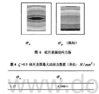 當(dāng)阻尼比g確定后,硅片表面動(dòng)應(yīng)力場的分布規(guī)律和數(shù)值是設(shè)計(jì)測量電路的重要依據(jù)。山圖6的應(yīng)力場分布云圖和表4的數(shù)據(jù)可以看到,硅片表面的口,、叮,沿硅片表面縱向和橫向中心線是對稱分布的,最大值滿足強(qiáng)度條件。這說明,硅片在動(dòng)態(tài)條件下叢本呈彎曲對稱變形。很顯然,這是一種理想的工作狀態(tài)。