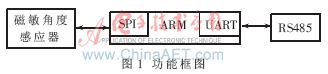 基于磁敏技術(shù)的位移傳感器主要由3個(gè)部分組成,前端角度信號采集、數(shù)據(jù)處理單元、數(shù)據(jù)通訊單元,具體的功能框圖如圖1所示。